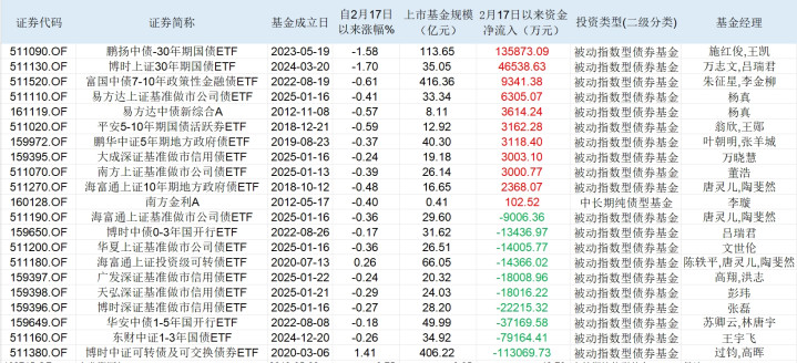 Wind数据显示,从2月17日至2月24日,3557只债券基金(包含纯债基金、混合债券型一二级基金、被动指数型债券基金)中,仅有76只收益率为正数。其中博时上证30年期国债ETF跌幅最大,为1.58%,该基金近三个月收益率为7.17%。